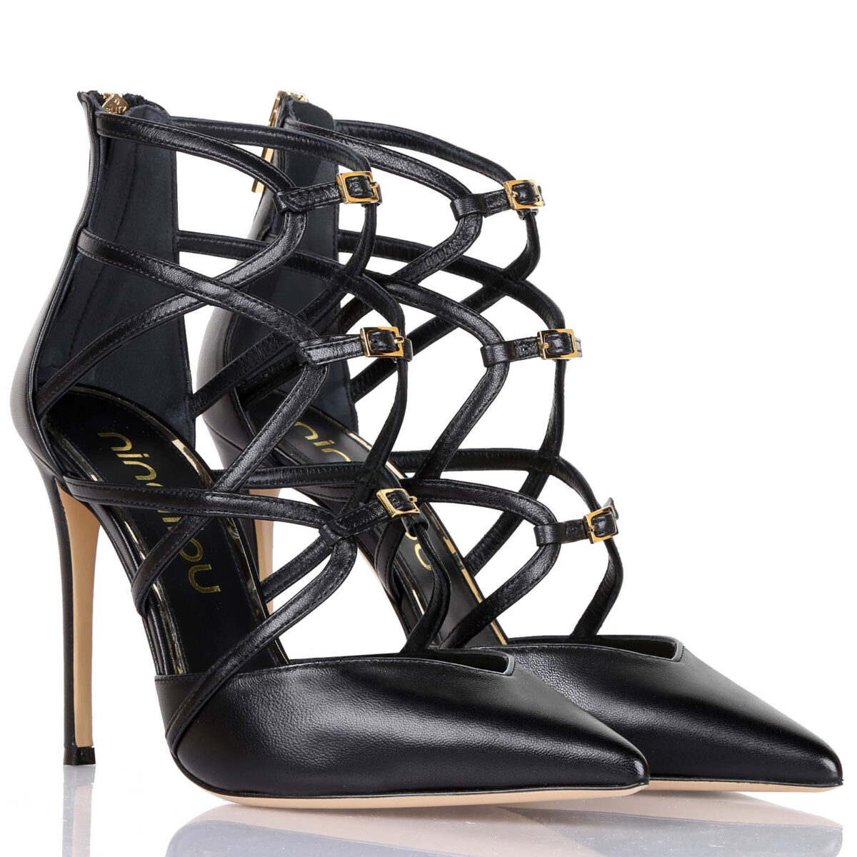 High heel point toe in soft nappa leather with straps on the instep. Leather sole. Heel height: 10,5 cm.