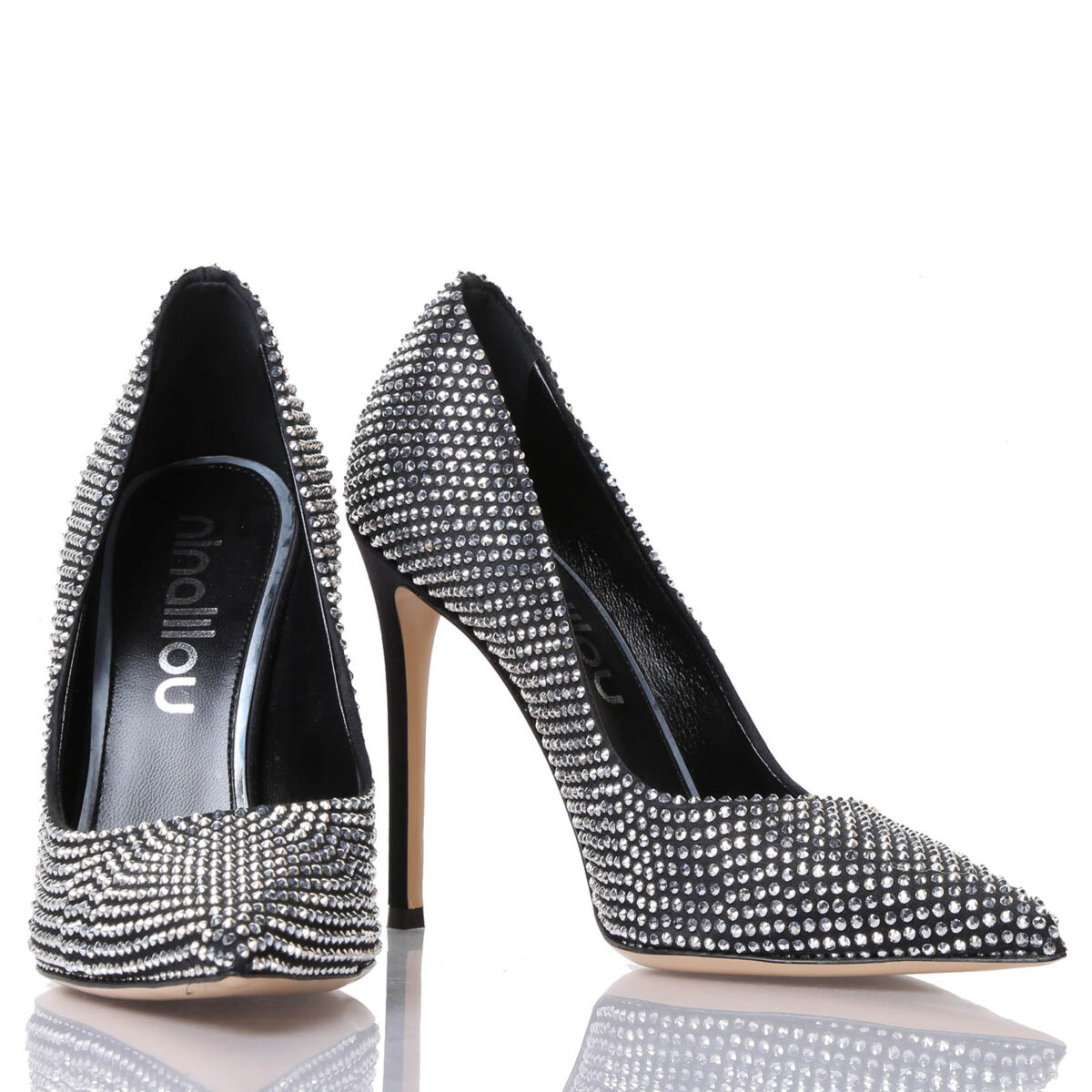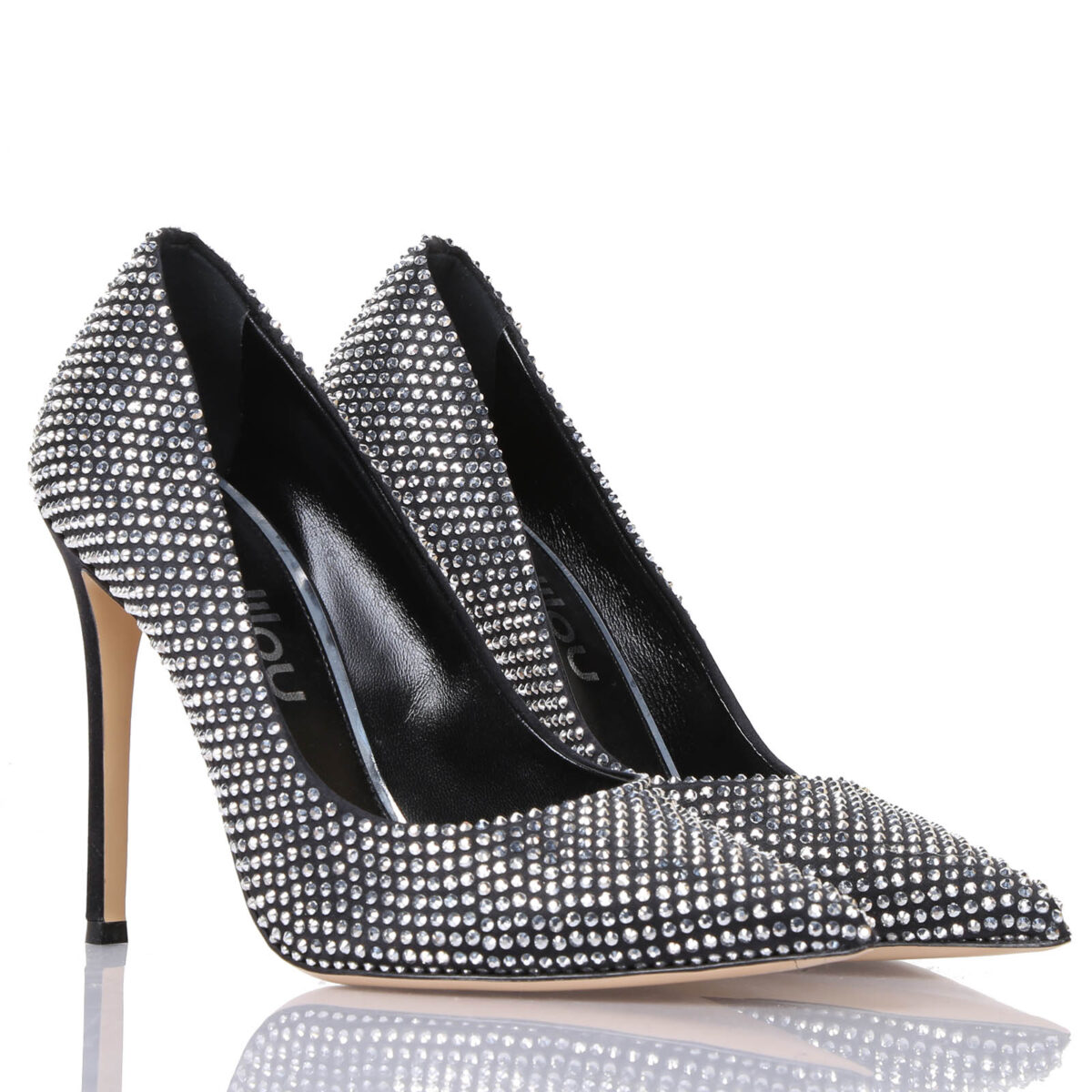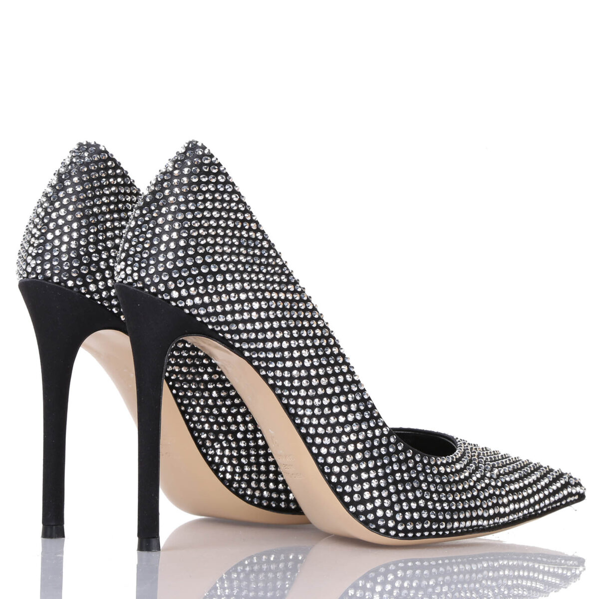 High heel point toe in fabric enriched with rihnestones, heel covered in mirror leather. Leather sole. Heel height: 10,5 cm.