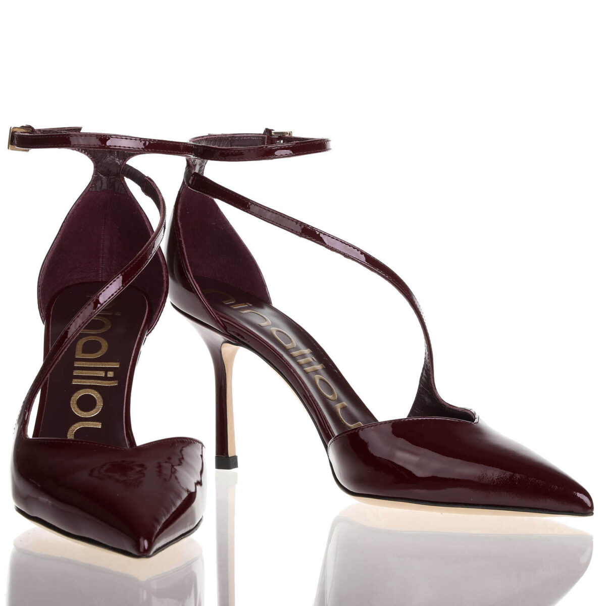 High heel ankle strap pump in patent leather. Pointed neckline. Leather sole, heel height 7,5 cm.