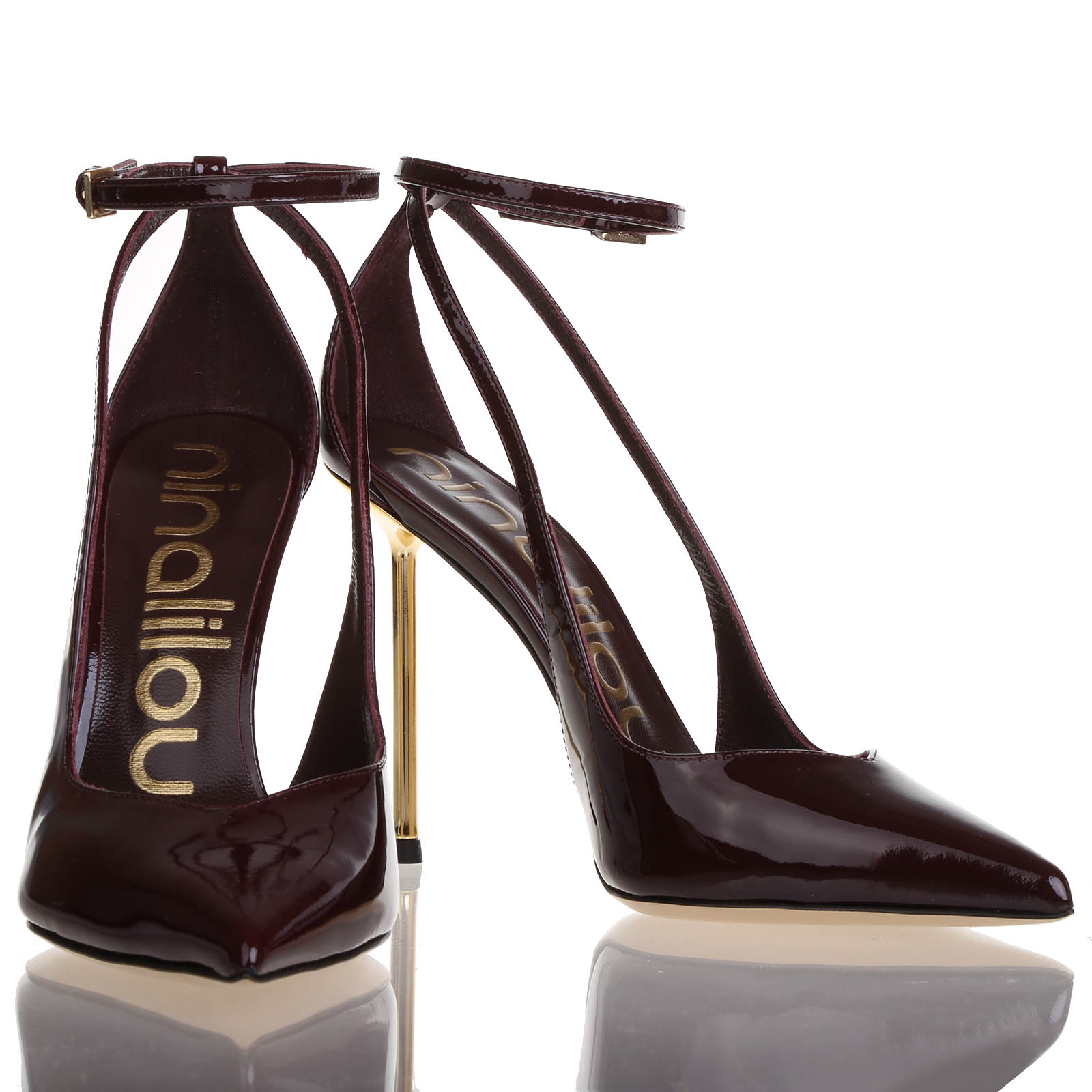 This Ninalilou pump in patent leather is the perfect blend of femininity and contemporary elegance. The sleek silhouette with its elongated pointed toe enhances the figure, while the slim ankle strap gently embraces the foot, ensuring both stability and charm. The golden Helen heel, graceful and refined, elevates the design with a sophisticated, modern touch. Ideal for evening looks or special occasions, it is the perfect choice for those who wish to stand out with style and elegance.