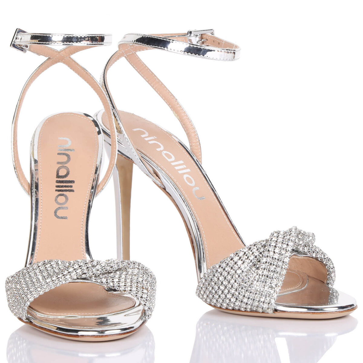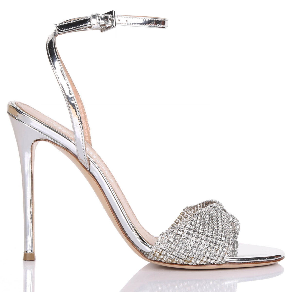 HIGH HEEL SANDALS IN MIRROR LEATHER ENRICHED WITH RHINESTONE. LEATHER SOLE. HEEL HEIGHT: 10,5 CM.