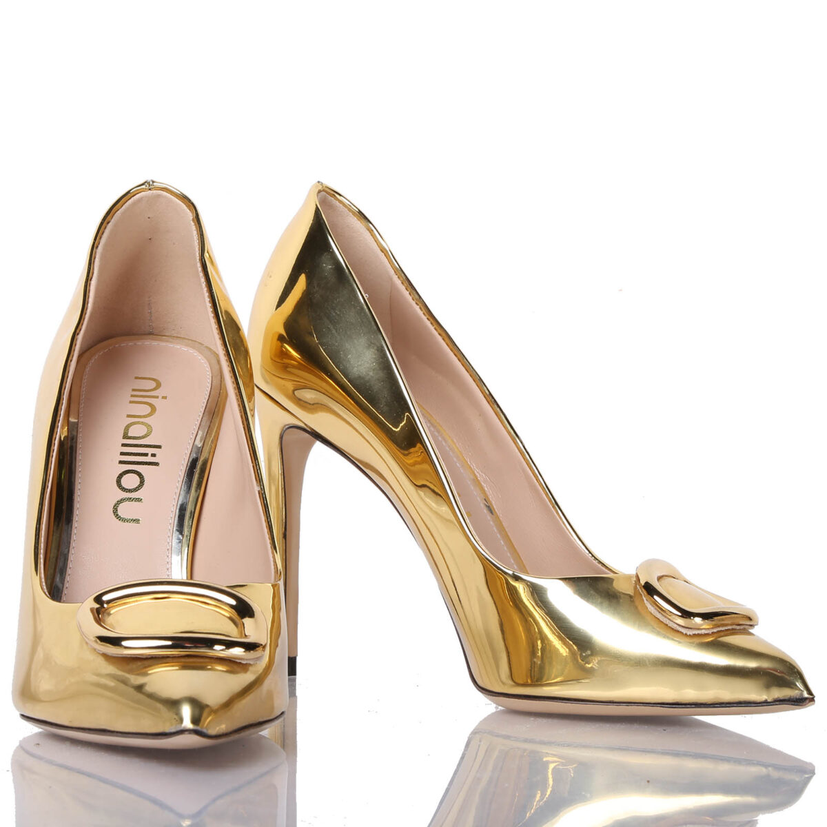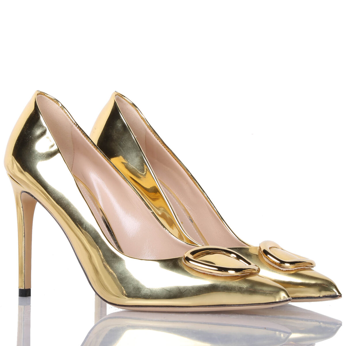 High heel point toe in mirror leather with tip accessory. Leather sole. Heel height: 9,5 cm.