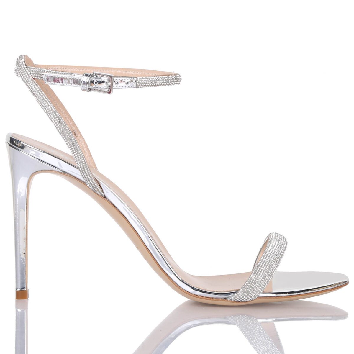 High heel ankle strap sandals in mirror leather enriched with rhinestone. Leather sole. Heel height: 9,5 cm.