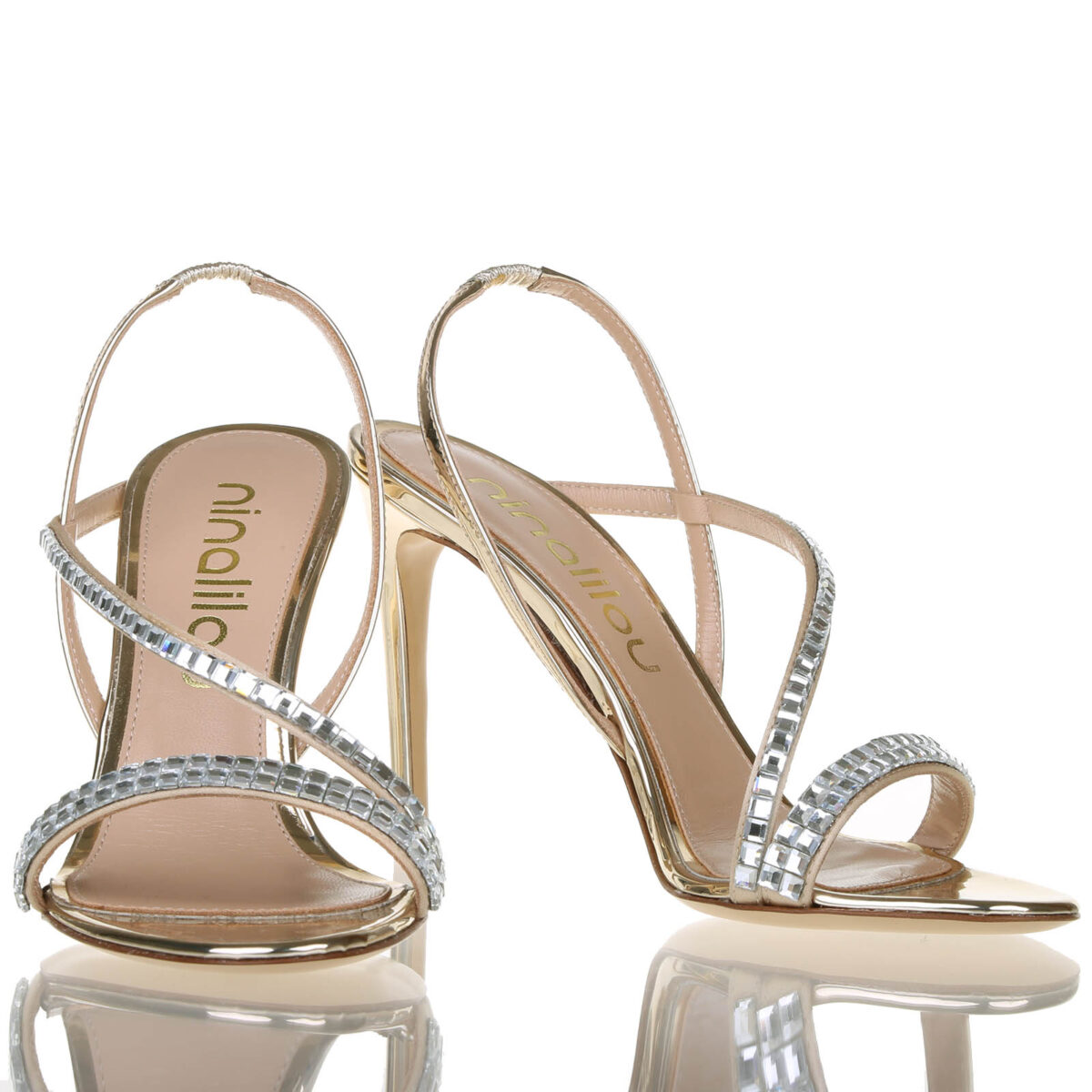 High heel ankle strap sandals in mirror leather with crystals application. Leather sole. Heel height: 9,5 cm.