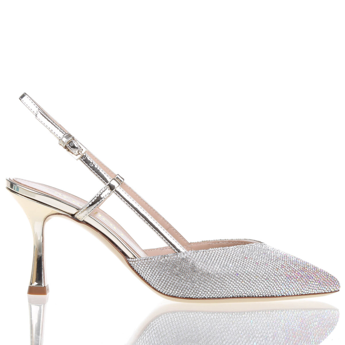 High heel point toe sling back in mirror leather, enriched with crystal rihnestone with aurora borealis nuance at the toe. Leather sole. Heel height: 7,5 cm.