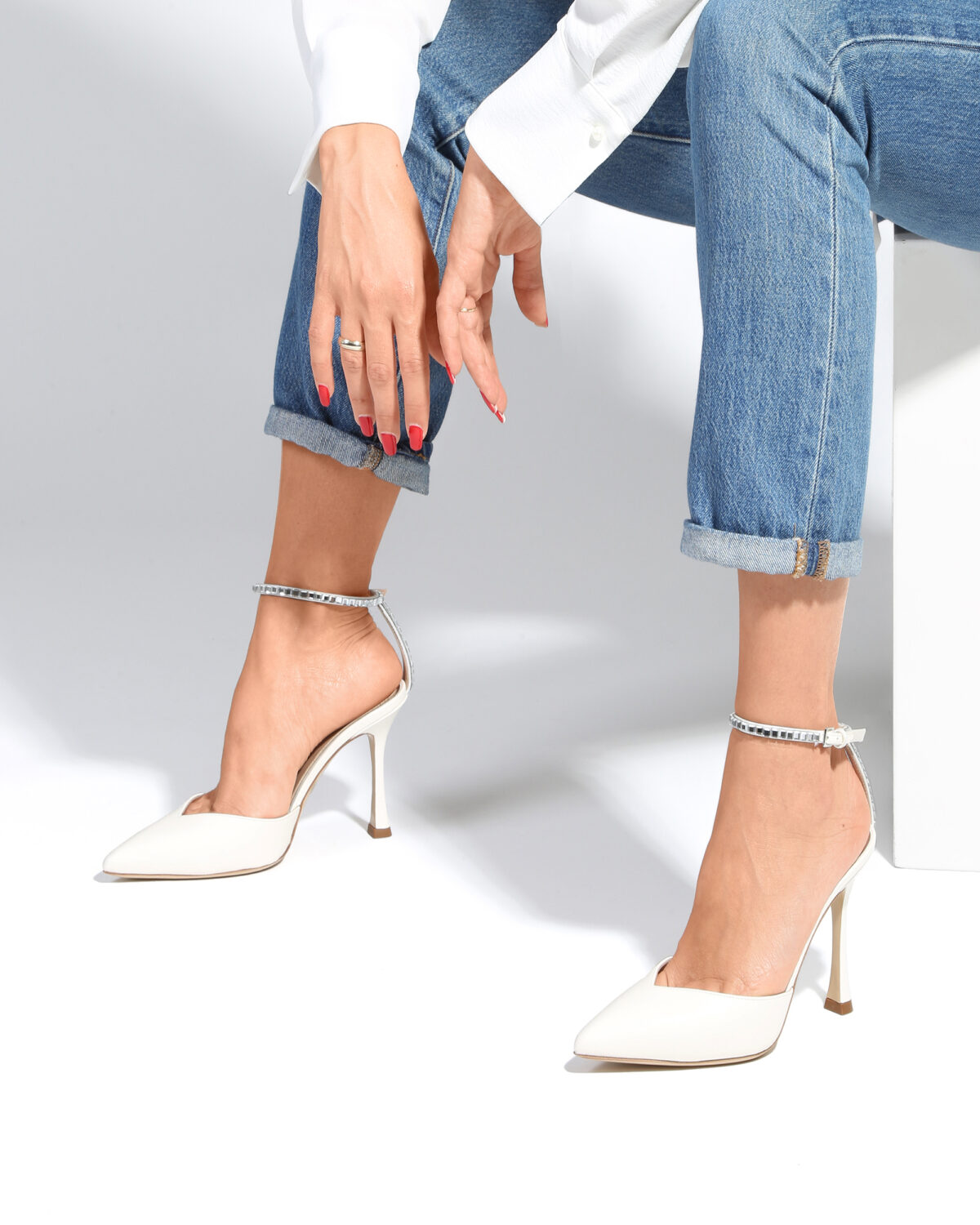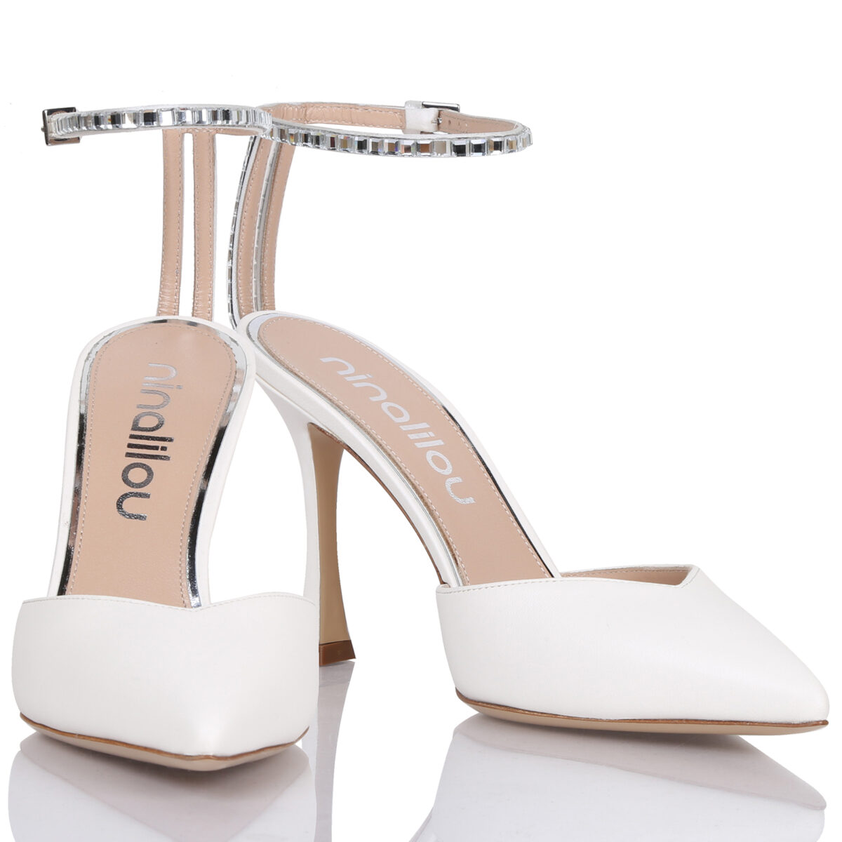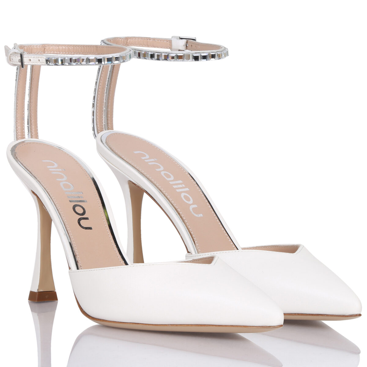 High heel point toe in nappa leather enriched with rhinestone. Leather sole. Heel height: 9,5 cm.