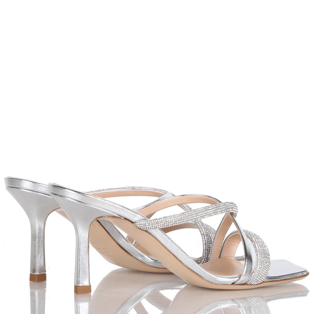 HIGH HEEL SANDAL IN METALLIC LEATHER ENRICHED WITH SWAROVSKI CRYSTAL. LEATHER SOLE. HEEL HEIGHT: 7 CM.