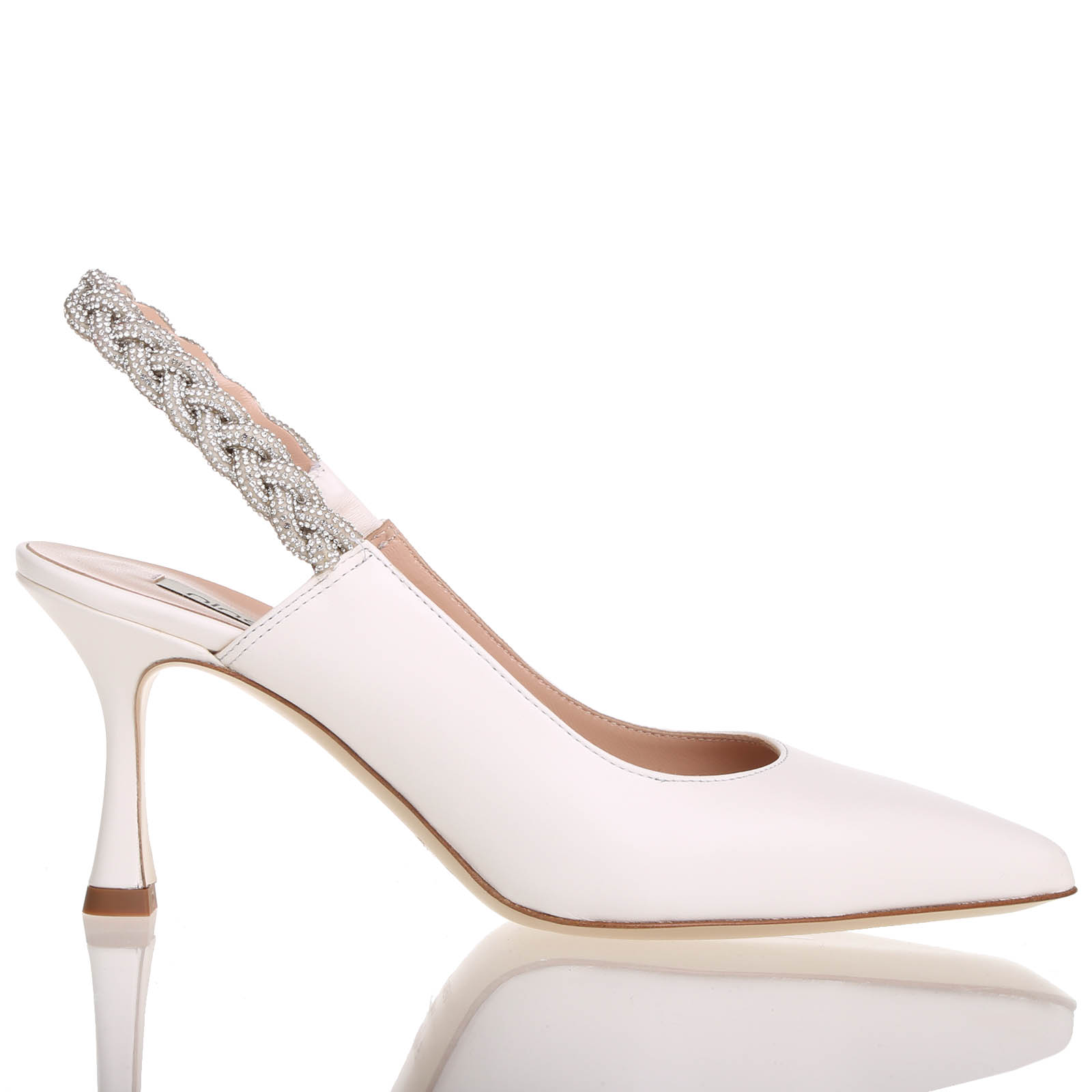 Decolletè in pelle. Ricamo a treccia con Swarovski. Suola in cuoio. Tacco 7 cm.