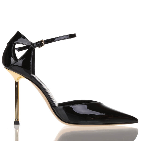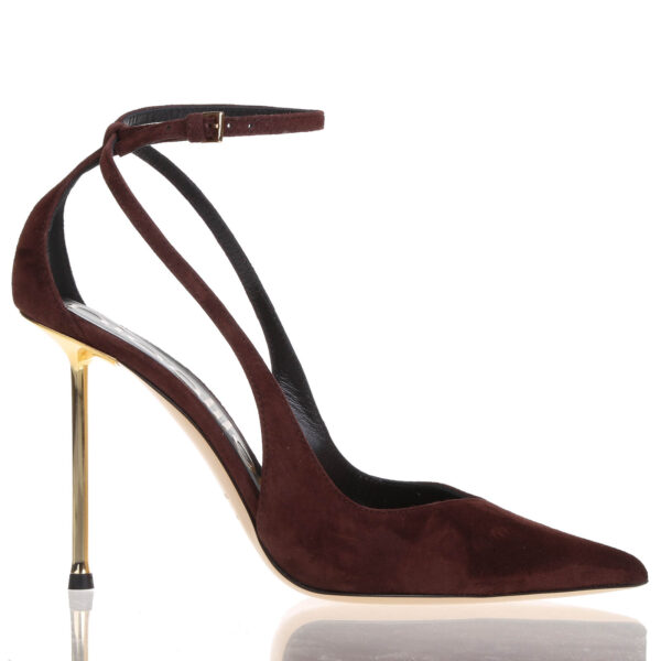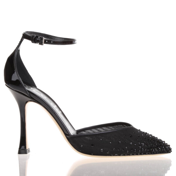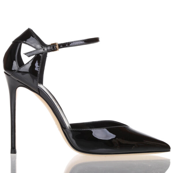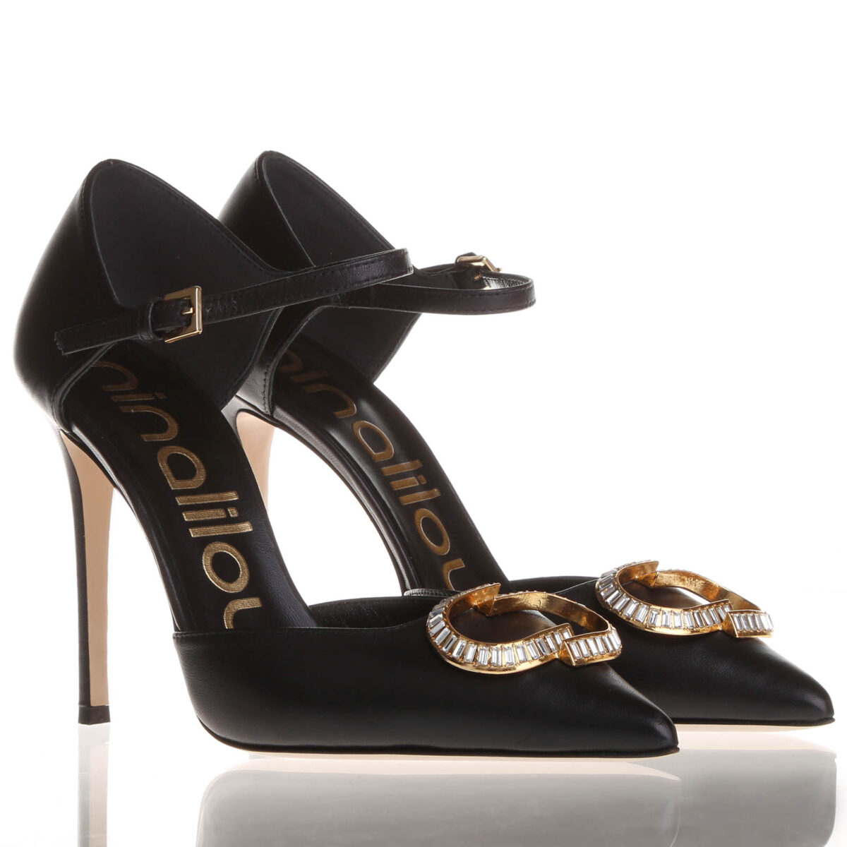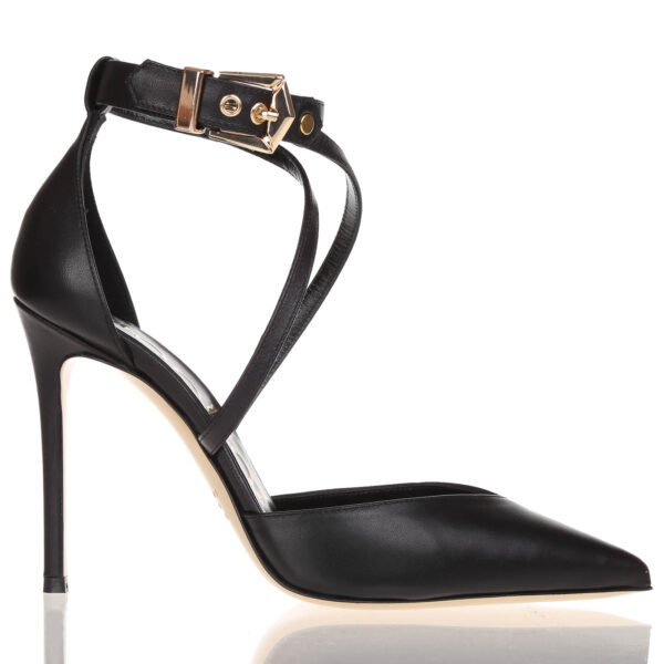 Decollete’ in nappa con cinturino alla caviglia e accessorio in punta. Suola in cuoio. Tacco 10,5 cm.