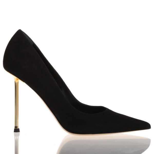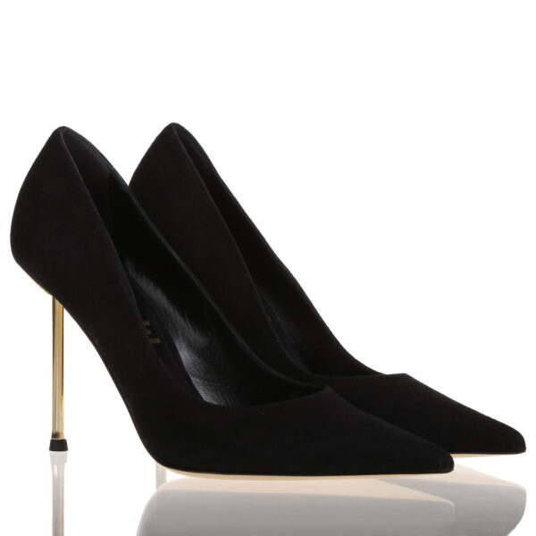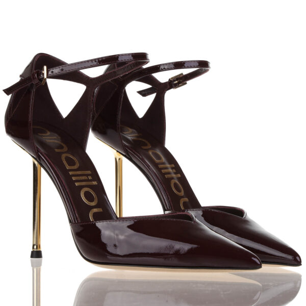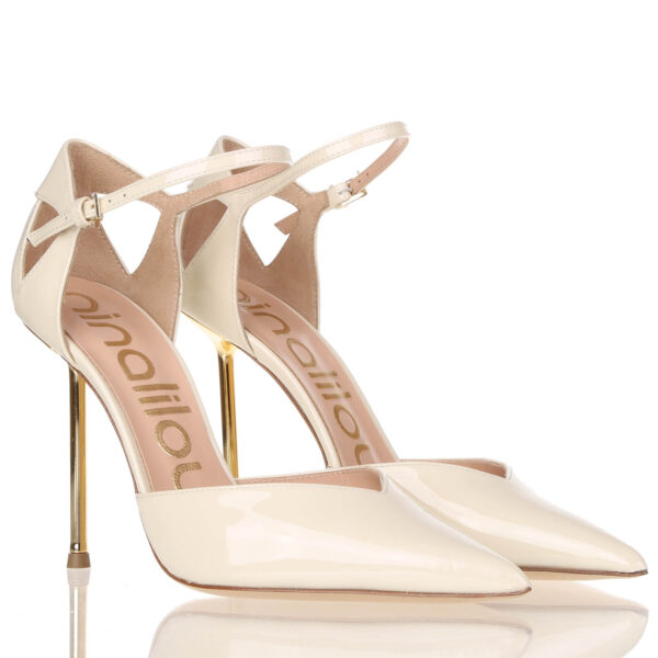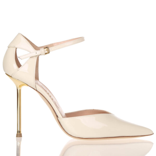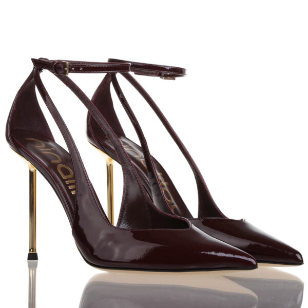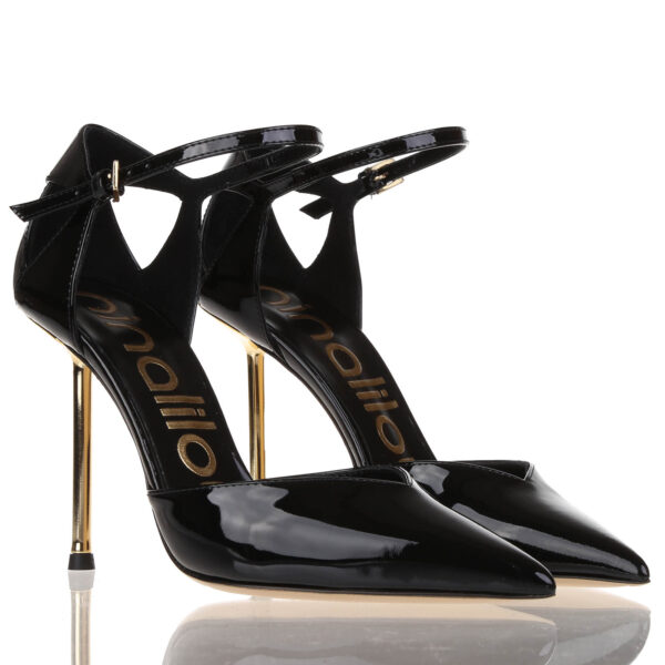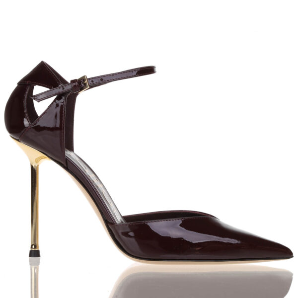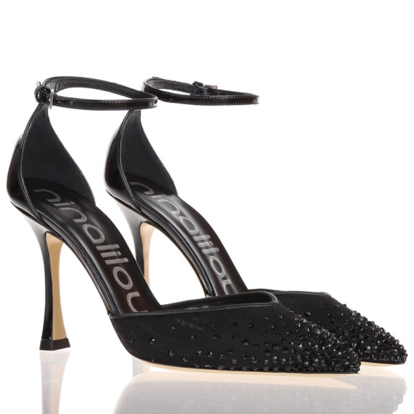 Decollete’ in nappa con cinturino alla caviglia e accessorio in punta. Suola in cuoio. Tacco 10,5 cm.
