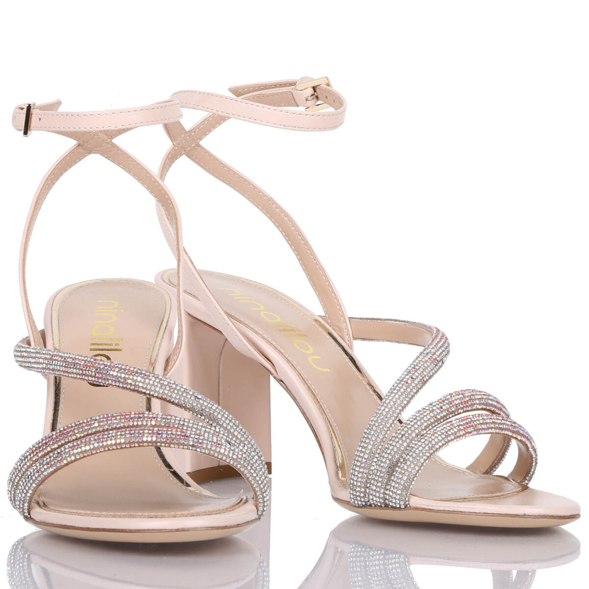 Sandalo alto in nappa con cinturino alla caviglia, ricamato con strass. Suola in cuoio, tacco 7,5 cm.