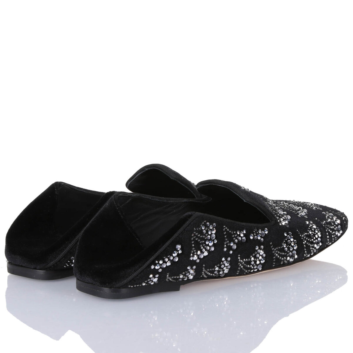 Mocassino a punta quadrata in velluto, arricchito da strass. Tallone morbido ripiegabile per calzata a sabot. Suola in cuoio, tacco 1 cm.