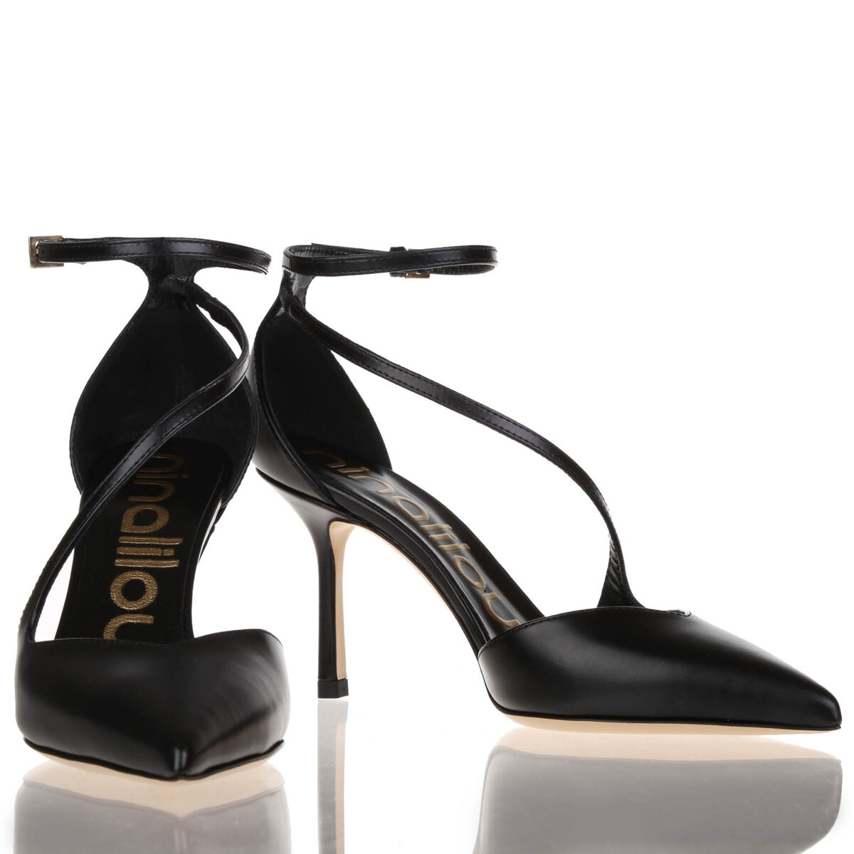Decollete’ in nappa con cinturino alla caviglia. Scollo a cuore. Suola in cuoio, tacco 7,5 cm.