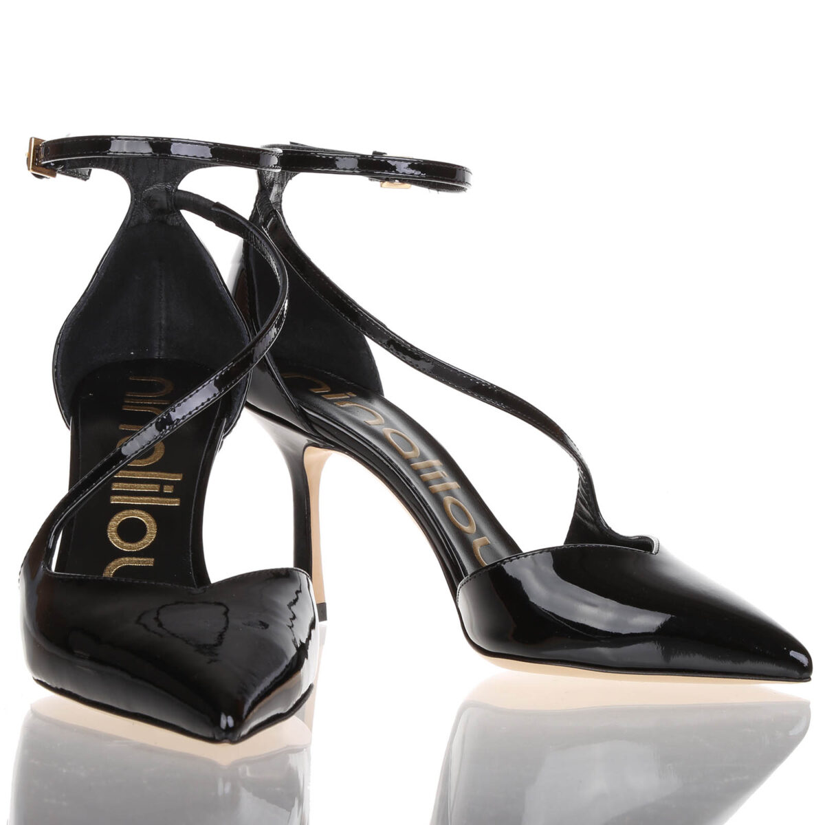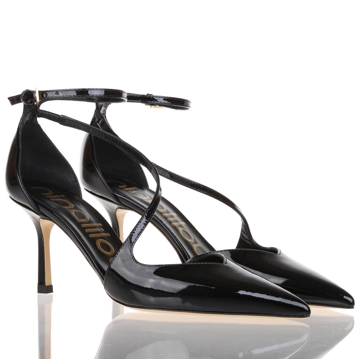 Decollete’ in vernice con cinturino alla caviglia. Scollo a cuore. Suola in cuoio, tacco 7,5 cm.