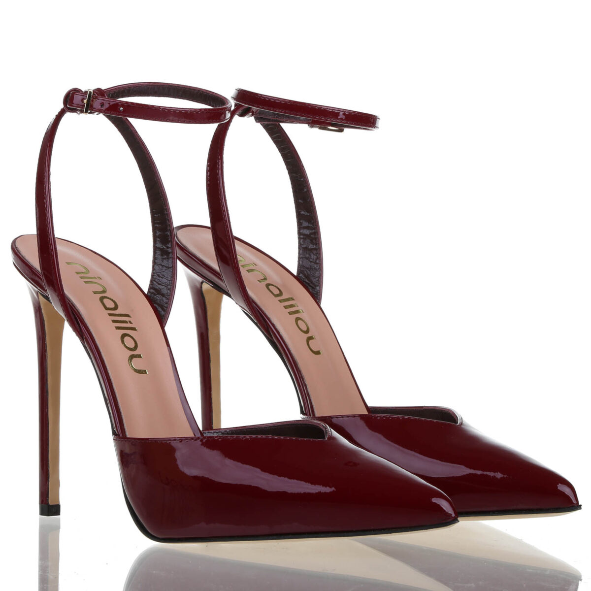 Décolleté in vernice con cinturino alla caviglia e scollo a cuore. Suola in cuoio. Tacco 11,5 cm con plateau 1 cm.