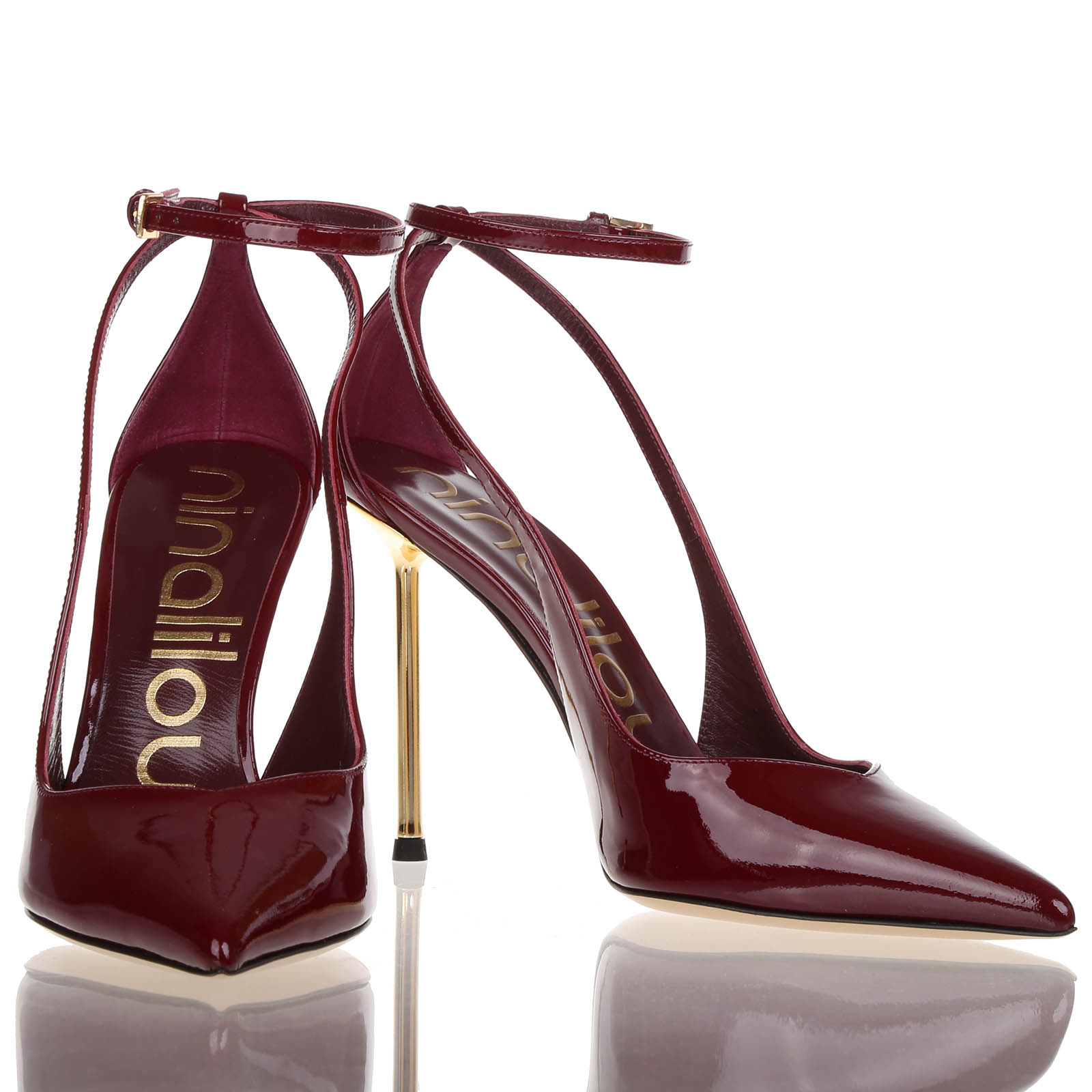 Questo decollete' Ninalilou in vernice bordeaux è un connubio perfetto tra femminilità ed eleganza contemporanea. La silhouette affusolata con punta slanciata valorizza la figura, mentre il sottile cinturino alla caviglia avvolge il piede con delicatezza, garantendo stabilità e charme. Il tacco Helen dorato, slanciato e raffinato, illumina il design con un tocco sofisticato e moderno. Ideale per look da sera o occasioni speciali, è la scelta perfetta per chi desidera distinguersi con stile e raffinatezza.