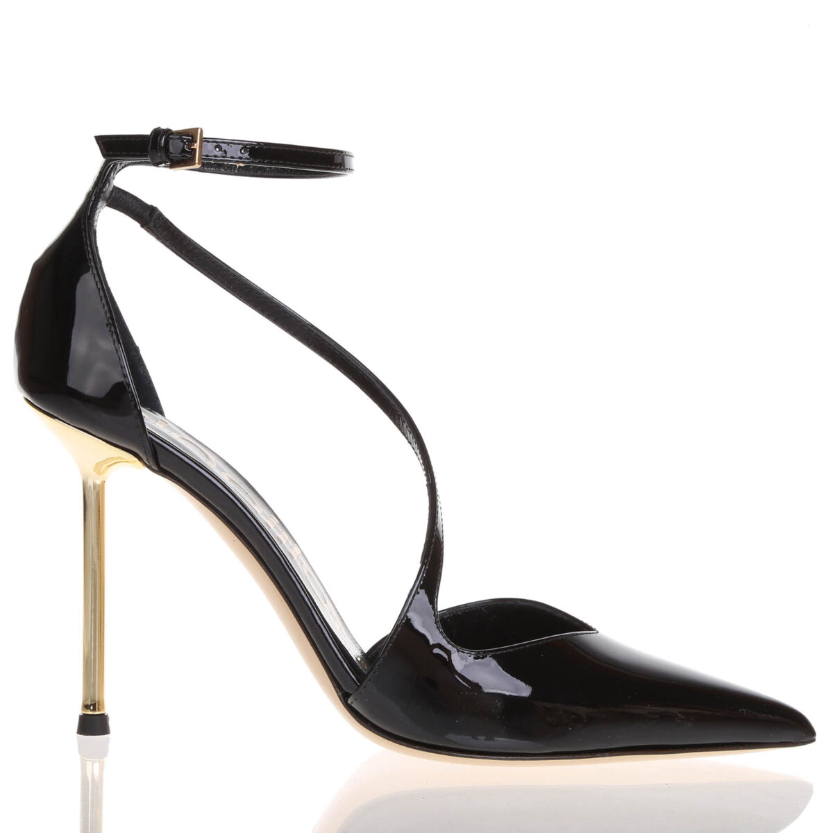 Decollete’ in vernice con cinturino alla caviglia. Scollo a cuore. Suola in cuoio, tacco cromato 10,5 cm.