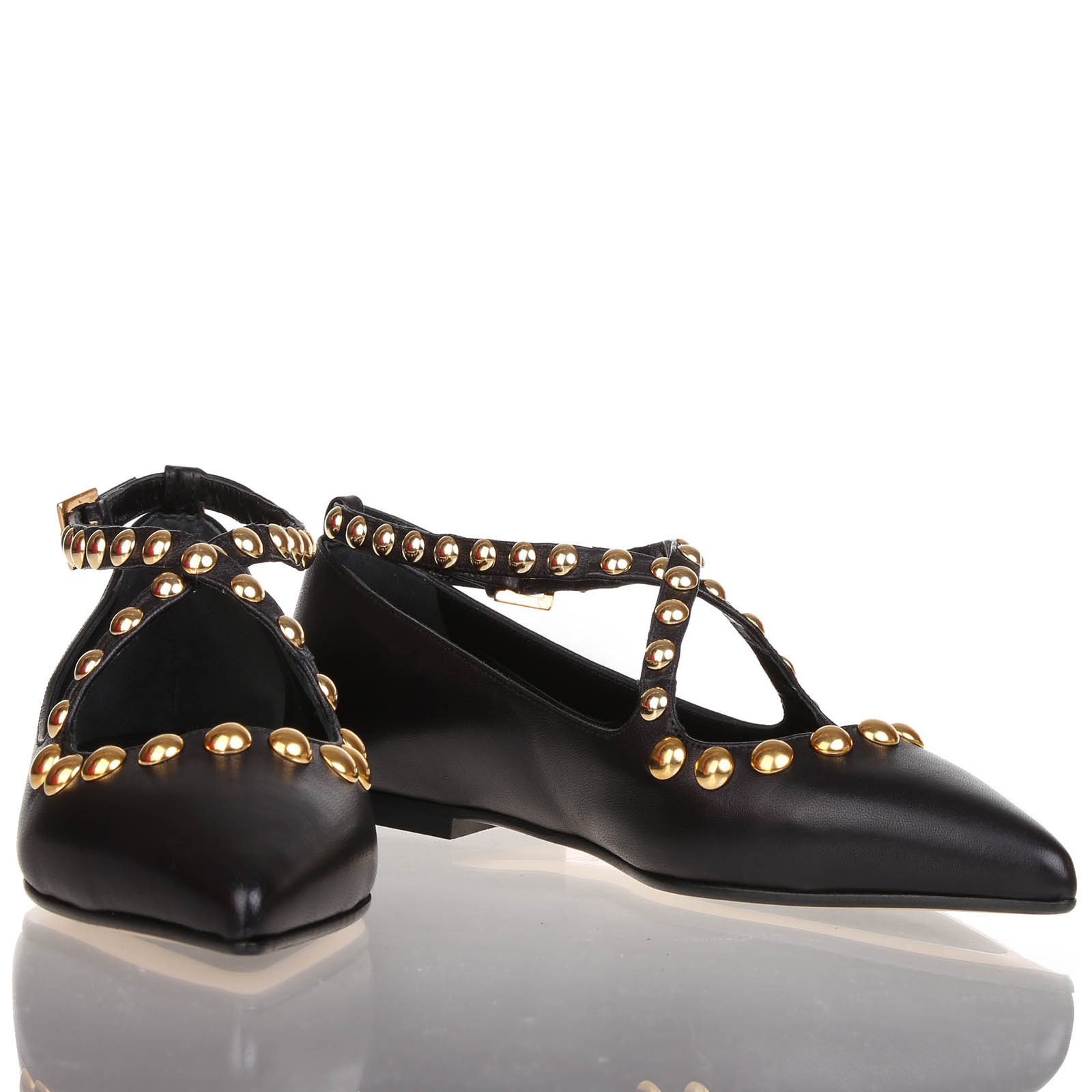 Scarpa bassa in morbida nappa con cinturini incrociati al collo del piede e applicazione di borchie. Suola in cuoio. Tacco 1 cm.