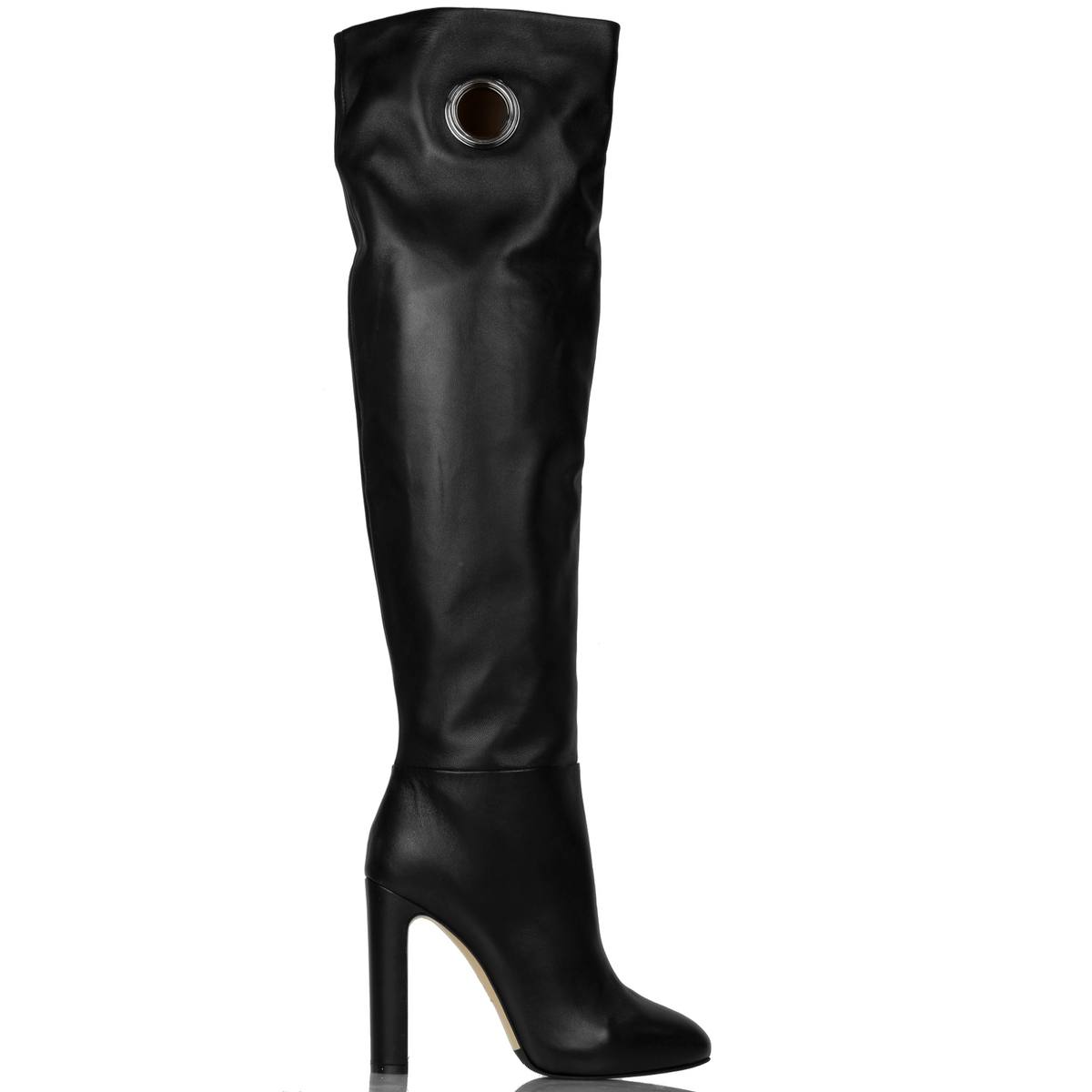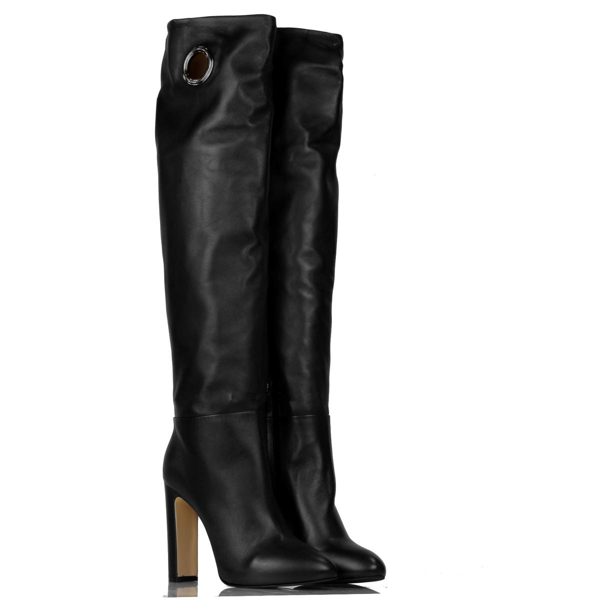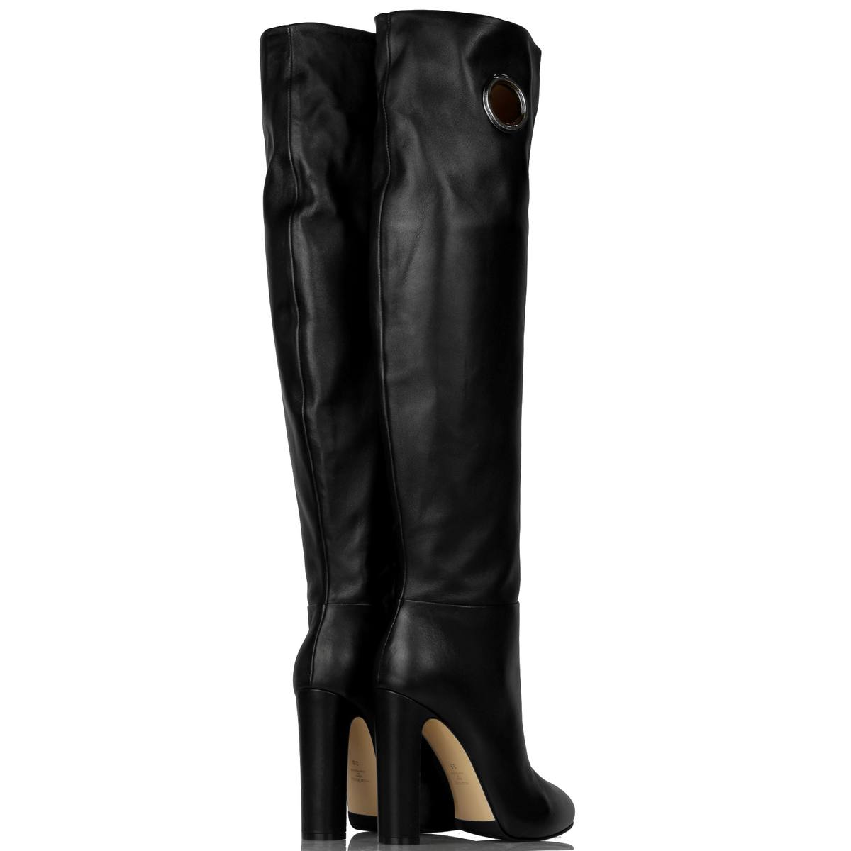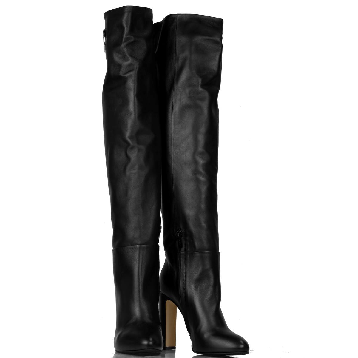 Stivale in morbida pelle con zip su lato interno. Suola in cuoio e gomma. Tacco 11 cm. Plateau interno: 1.5 cm. Altezza gambale: 52 cm.