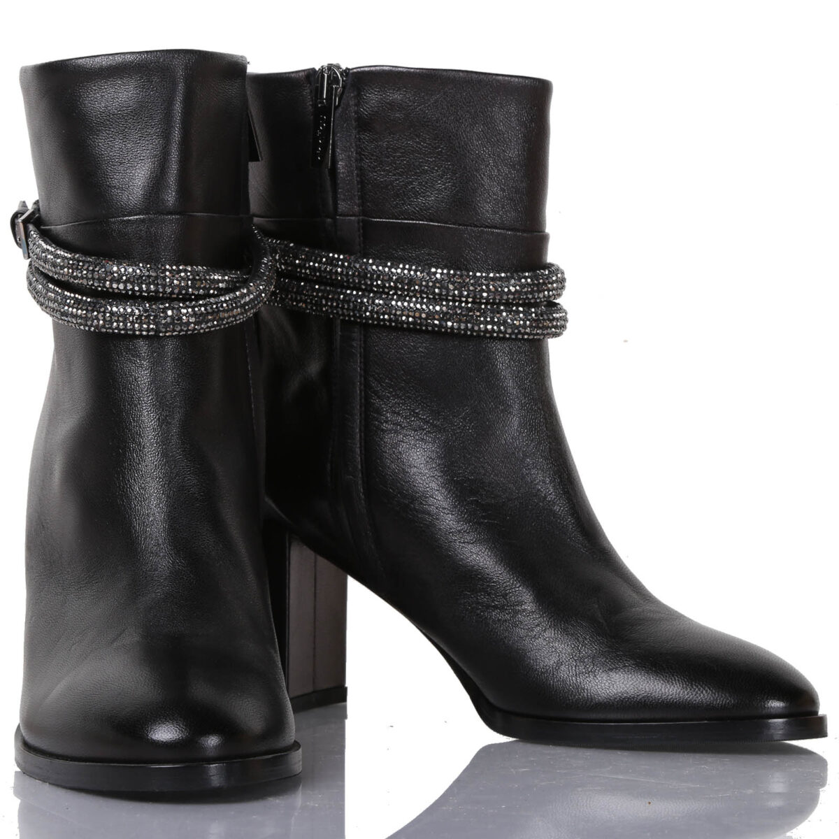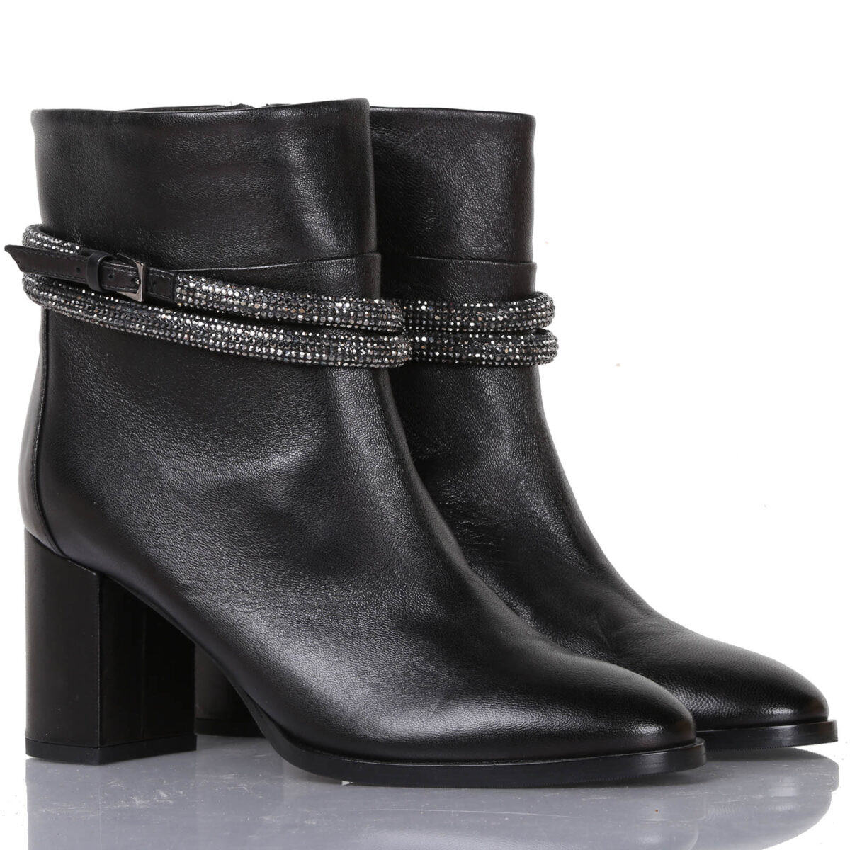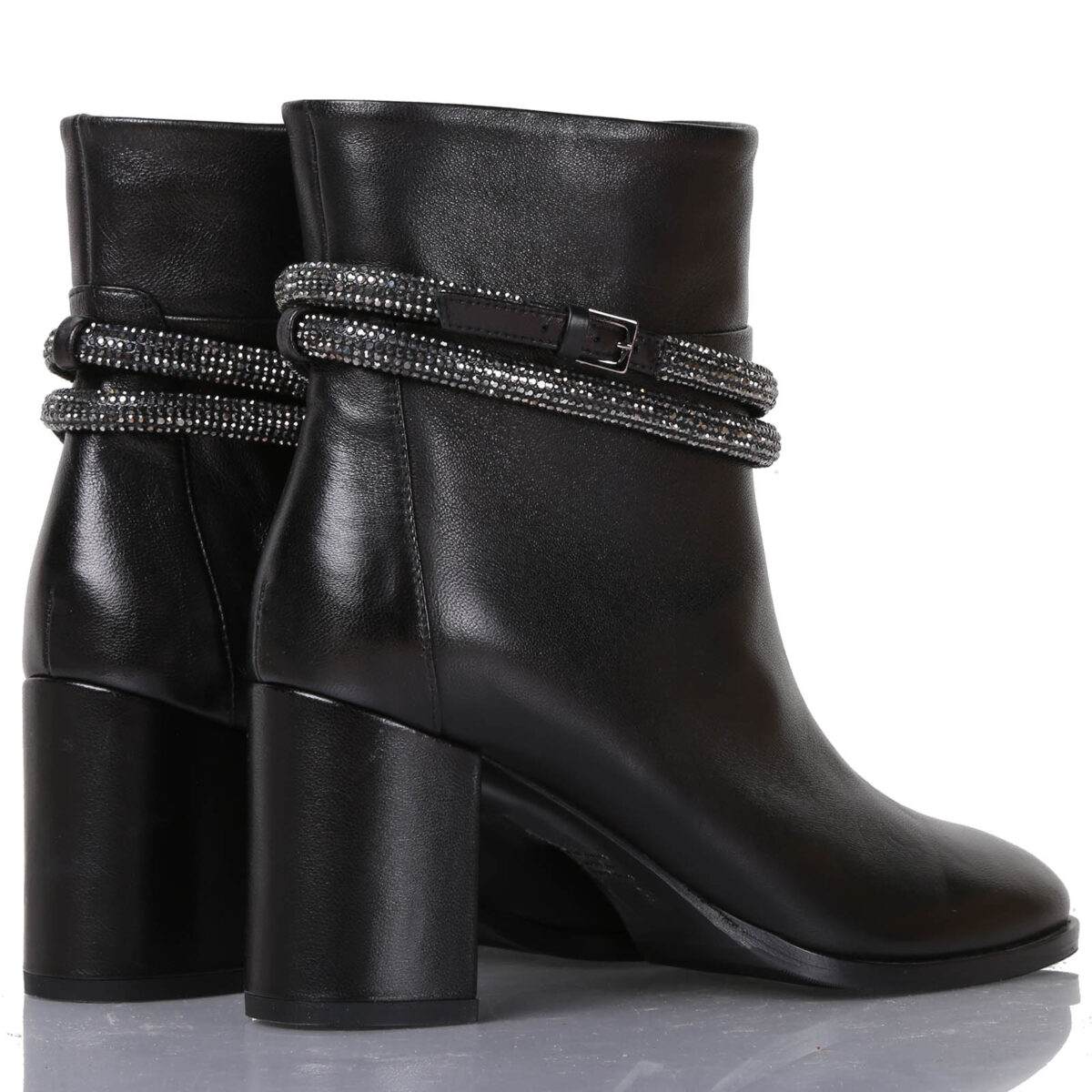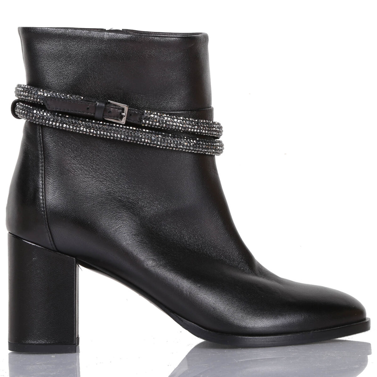 Tronchetto in pelle e accessorio arricchito di strass. Suola in gomma, tacco 7,5 cm.