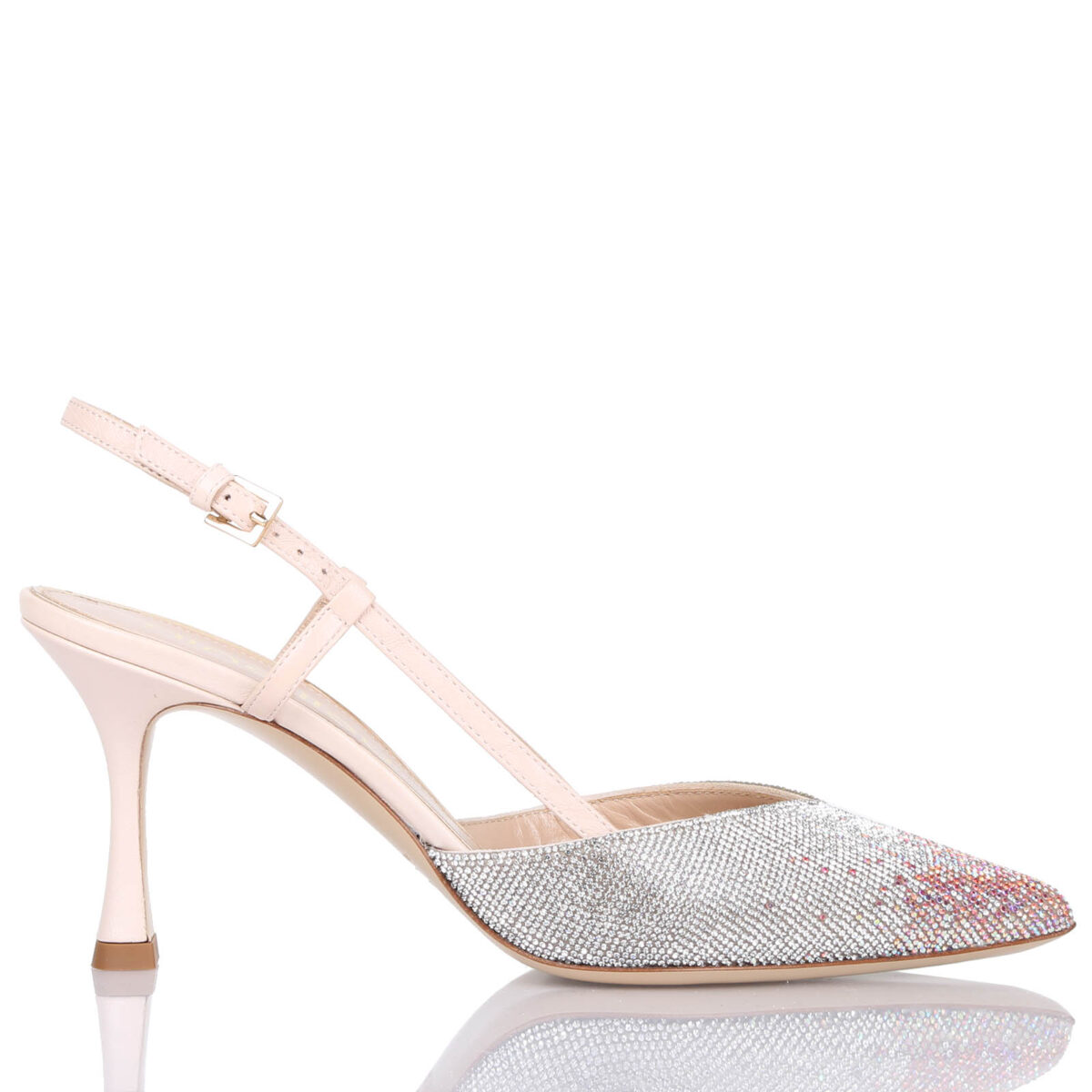 Décolleté aperta dietro in morbida nappa, con cinturino alla caviglia. Applicazione di strass cristallo e sfumatura aurora boreale in punta. Suola in cuoio. Tacco 7,5 cm.