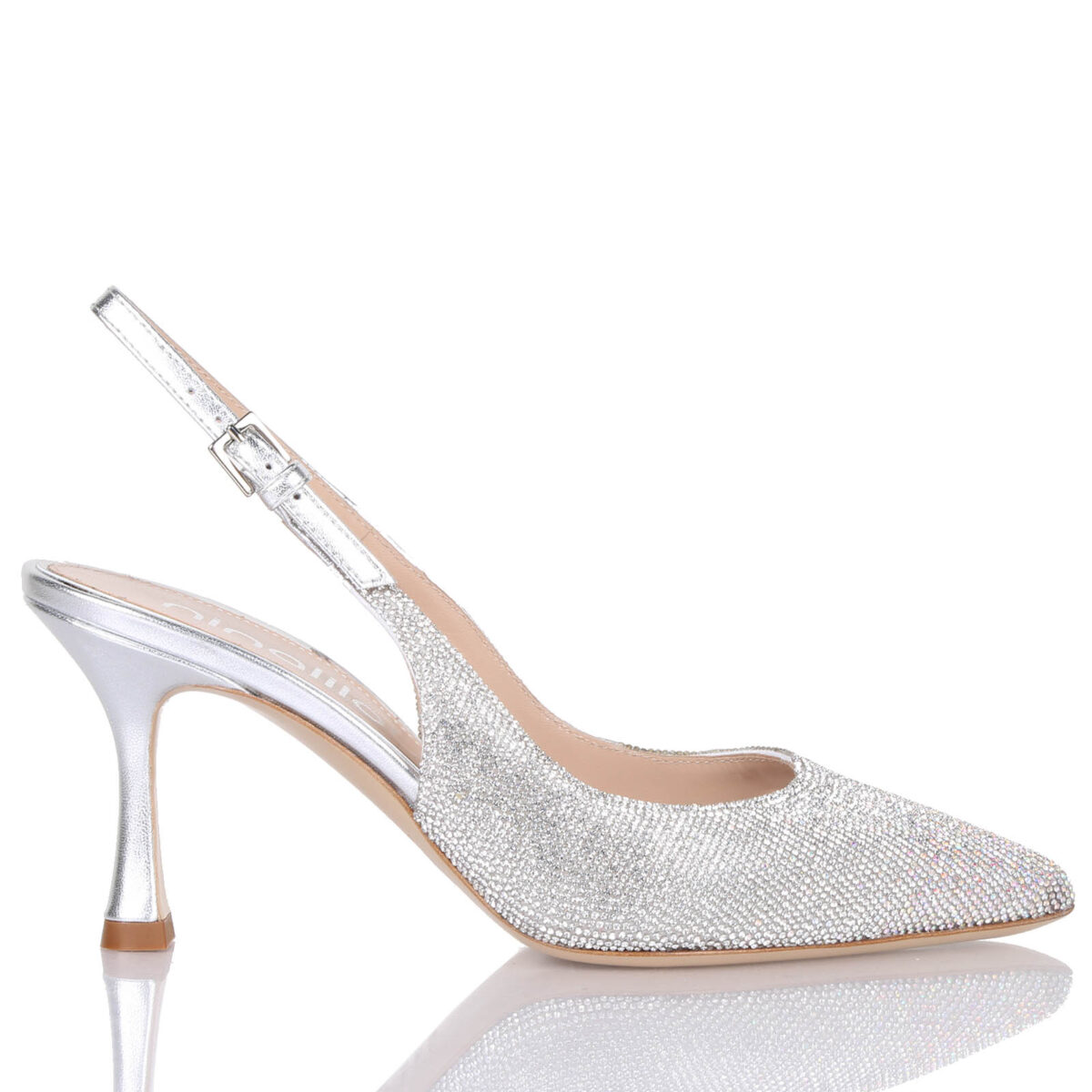Décolleté  in nappa laminata con applicazione di strass cristallo e sfumati aurora boreale sulla punta. Suola in cuoio. Tacco 7,5 cm.