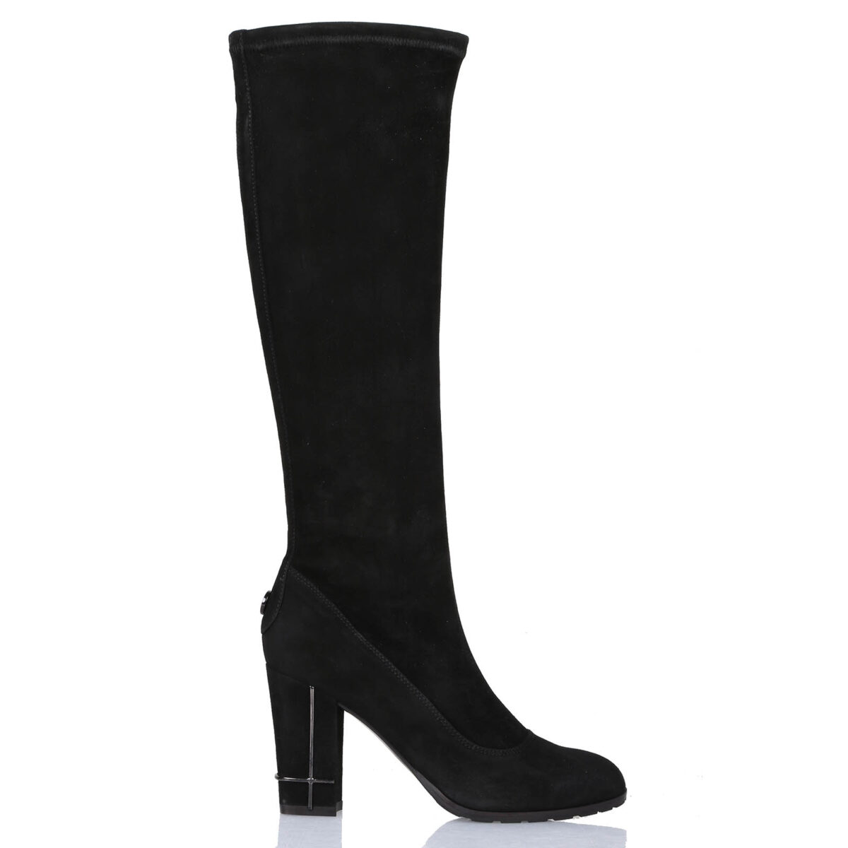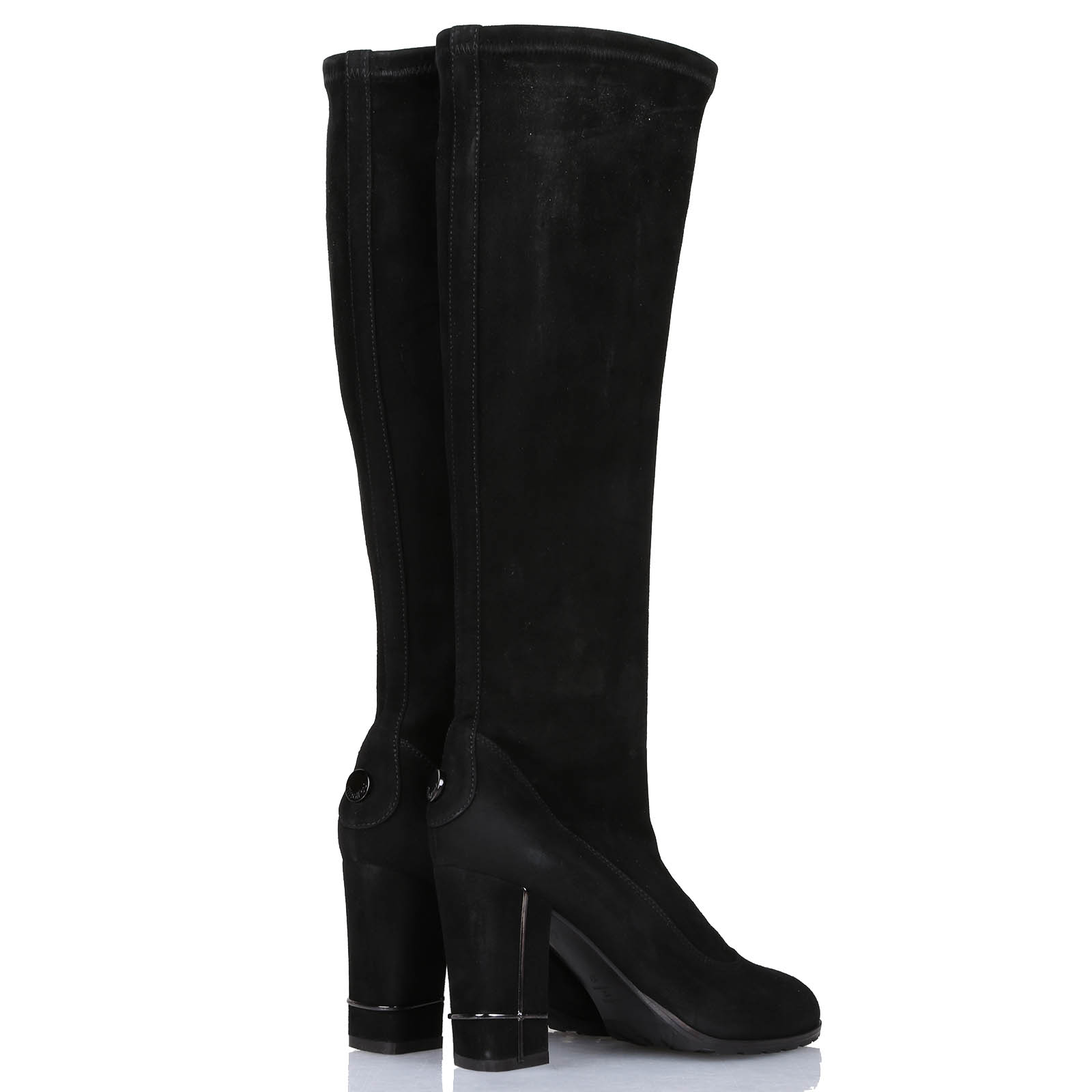 Stivale in camoscio elasticizzato. Altezza gambale: 39 cm. Suola in cuoio. Tacco con strass accessorio: 8,5 cm.