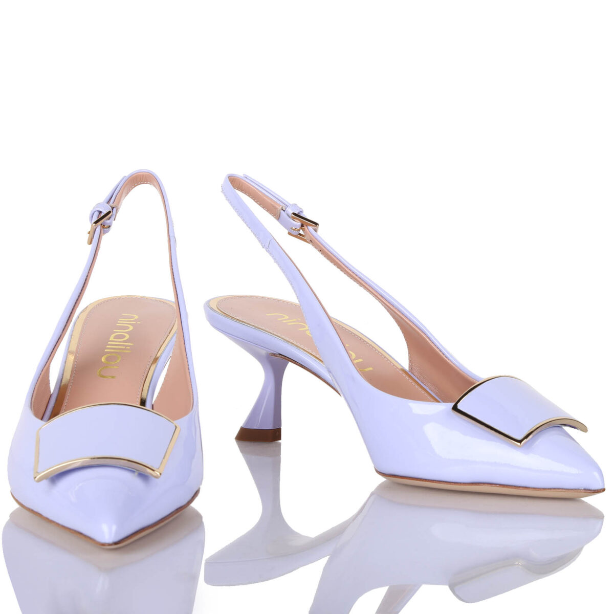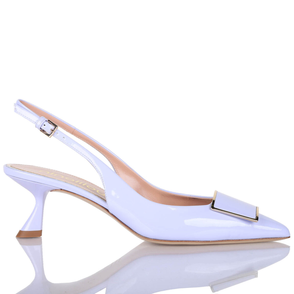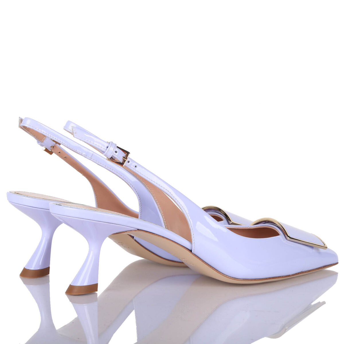 Décolleté aperta dietro in vernice con accessorio in punta. Suola in cuoio, tacco laccato: 5,5 cm.