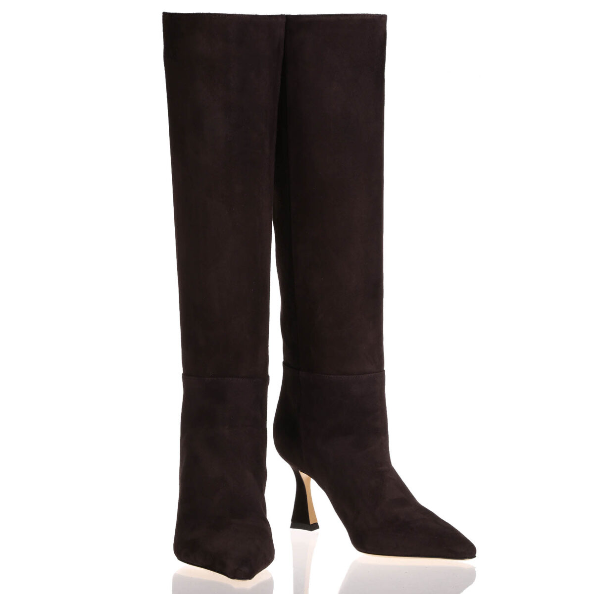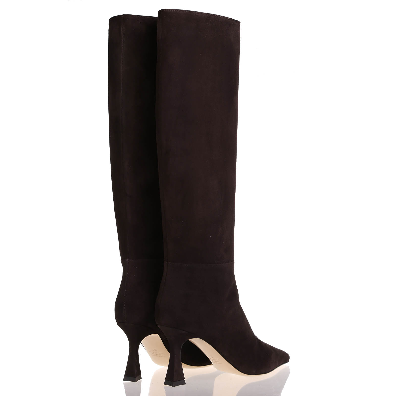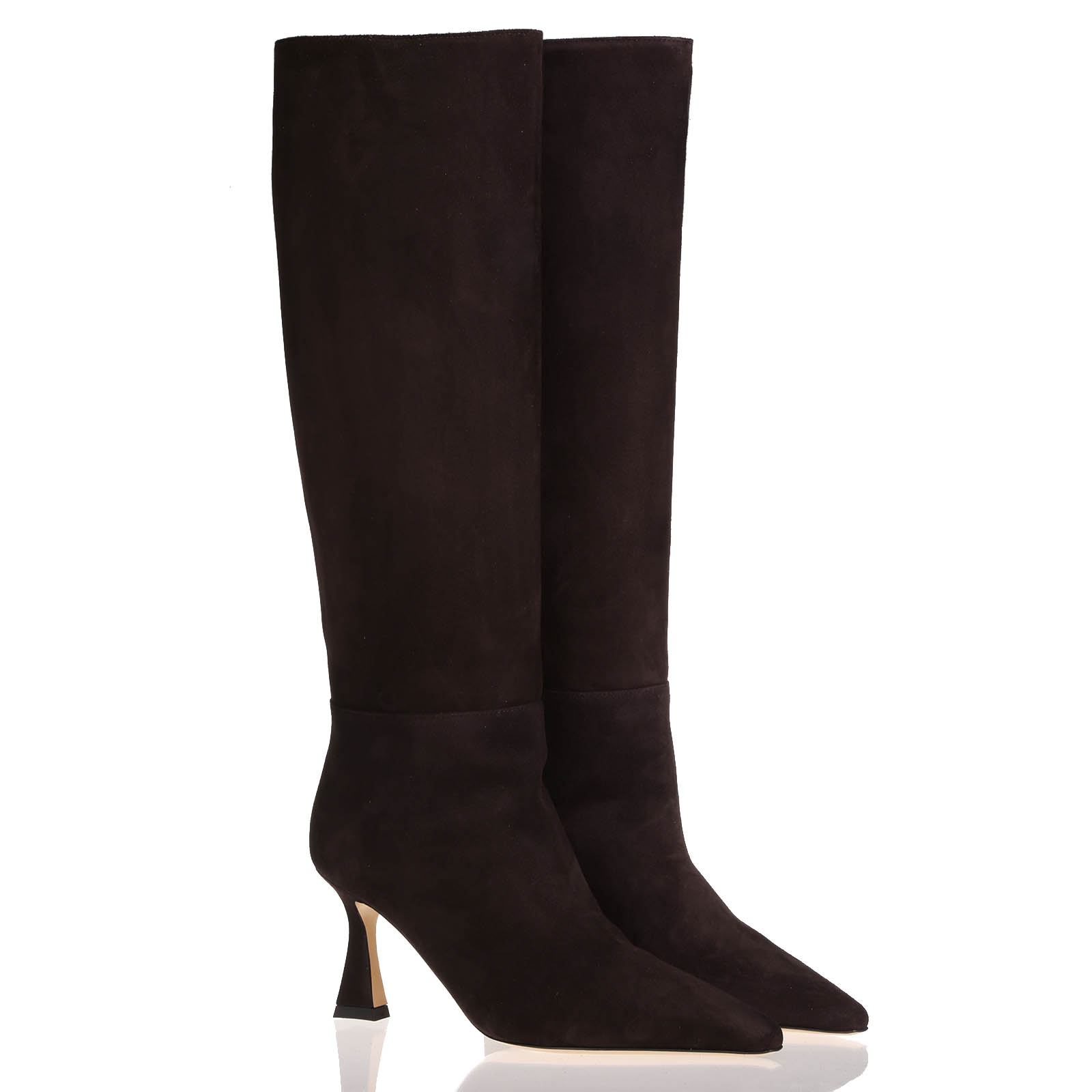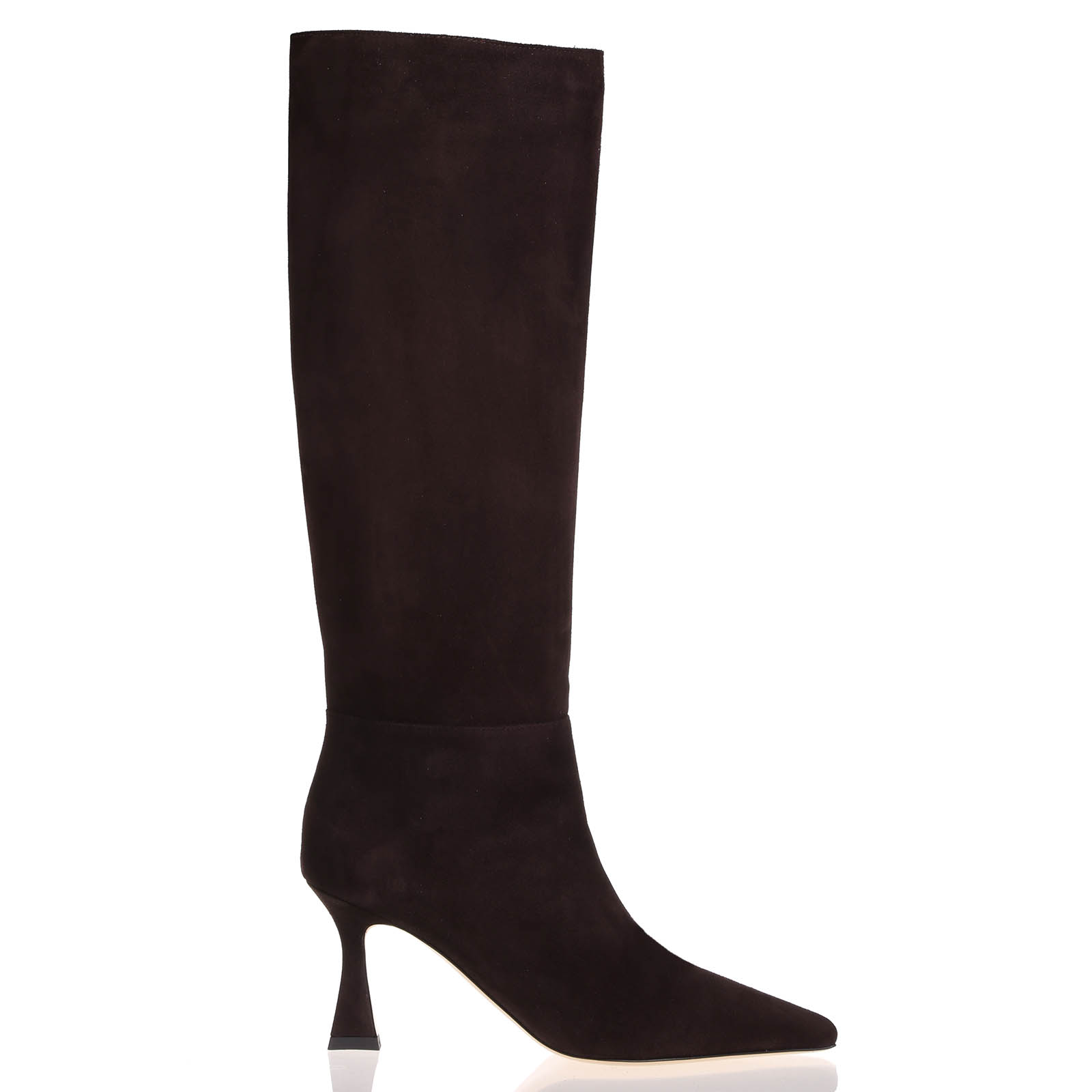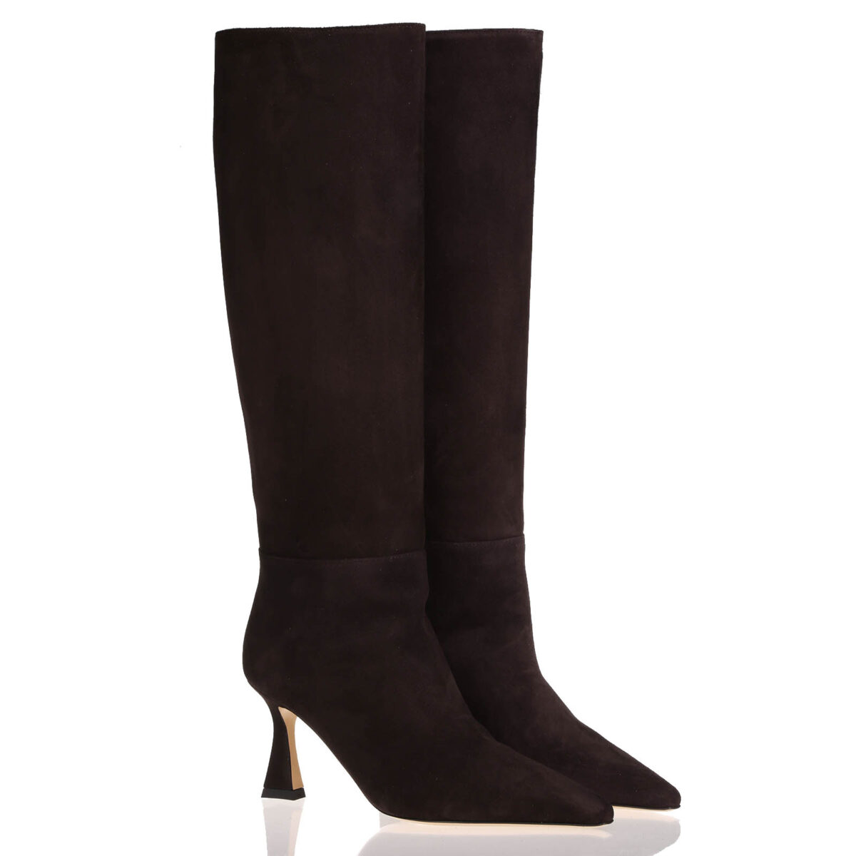 Stivale a punta in morbido camoscio. Altezza gambale 40 cm. Suola in cuoio, tacco 7,5 cm.